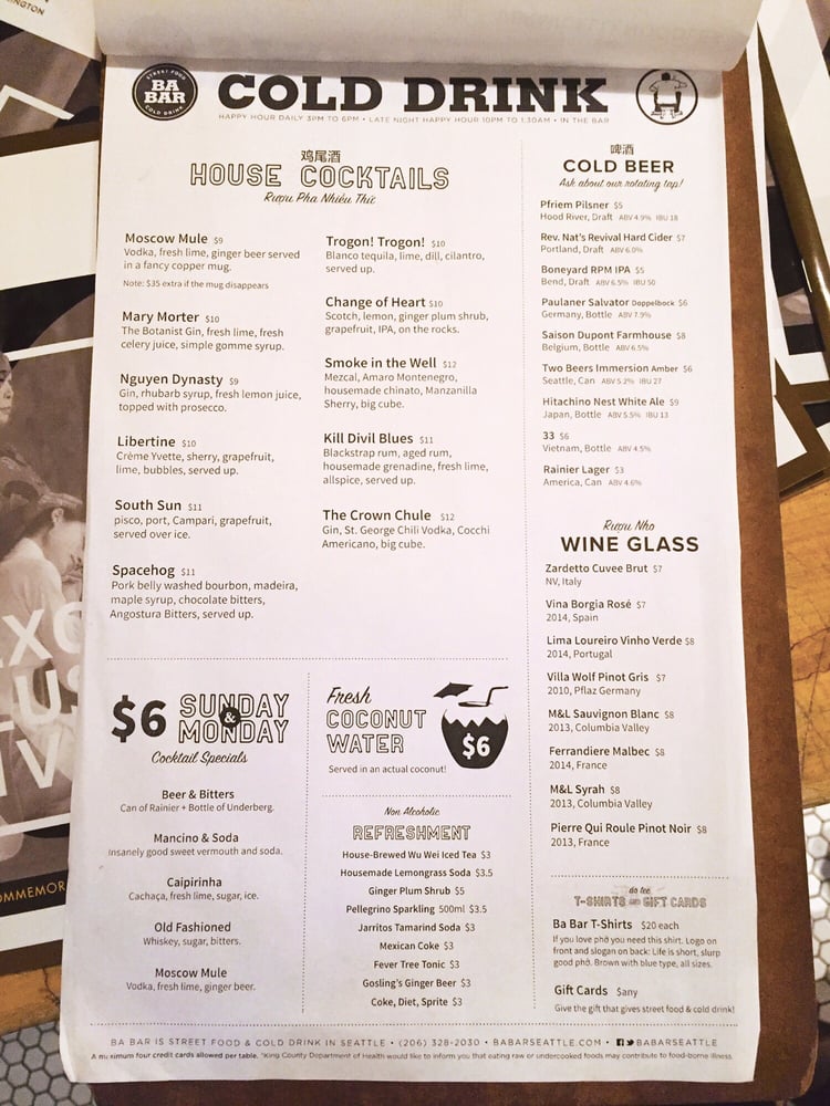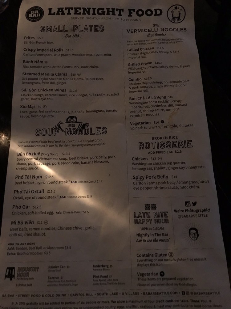 Ba Bar in Seattle, WA is a Vietnamese cocktail bar known for its diverse menu options. Offering delivery, takeout, and reservations, Ba Bar caters to all preferences with pescatarian, vegan, and limited vegetarian choices. The restaurant provides a casual and vibrant atmosphere, perfect for lunch, dinner, or late-night outings.